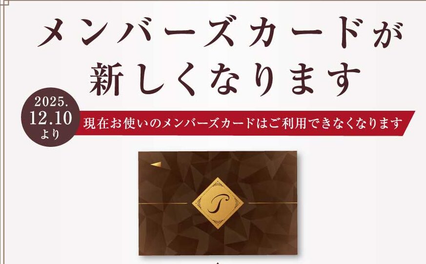 2025/12/10 より、現在お使いのメンバーズカードはご利用できなくなります。 新メンバーズカード 2025年12月10日より名東店のみご利用可。 現在のメンバーズカードは 2025年12月10日より、ご利用不可となります。 ただいま1Fフロントにて 新メンバーズカードをお渡ししております。 メンバーズカード移行申告書に、現在ご利用のメンバーズカードNo.をご記入し、 お帰りの際にフロントまでお立ち寄りください。 [...]
